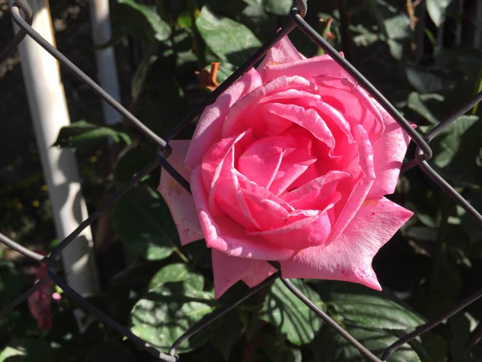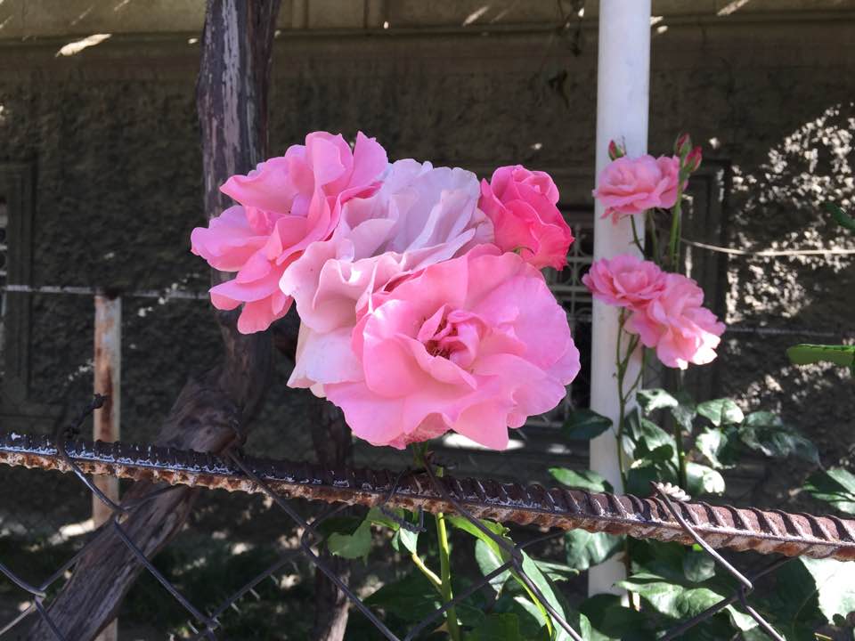 We walked out into the bright morning, and pink roses greeted us on both sides of the narrow street. I hadn’t seen them when we arrived in the dark.