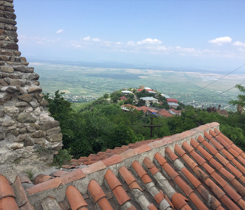 Next we drove a short distance into the town of Sighnaghi. Unfortunately the museum is closed on Mondays. But we walked around the lovely little town, running into a cousin from the night before who took us to the market where her mother sold churchkhela, or homemade Georgian Snickers. She cut several strings of the hand dipped candy as a gift for us. We walked to the crest of the hill where the ruins of an old fortress stood. Our time there was short because it was just a stop along our way to wine country, and beyond.