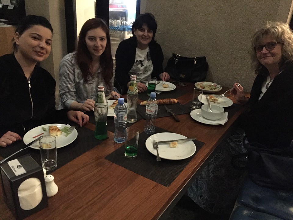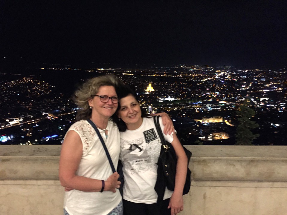 When we returned to our hotel, old, tired people might have been ready to call it a night. But not us. Lia, Elene, and a cousin we met the night before, Tamara, picked up us around 9 p.m. Tamara, or “Tako,” 28, is a funny and brave young woman, who owns her own car and drives in Tbilisi. And she drove quite responsibly. I asked Elene if she drove, and her eyes got big and she shook her head emphatically no. So, it wasn’t my imagination that most drivers in Georgia drove a bit recklessly? Elene concurred with my observation.