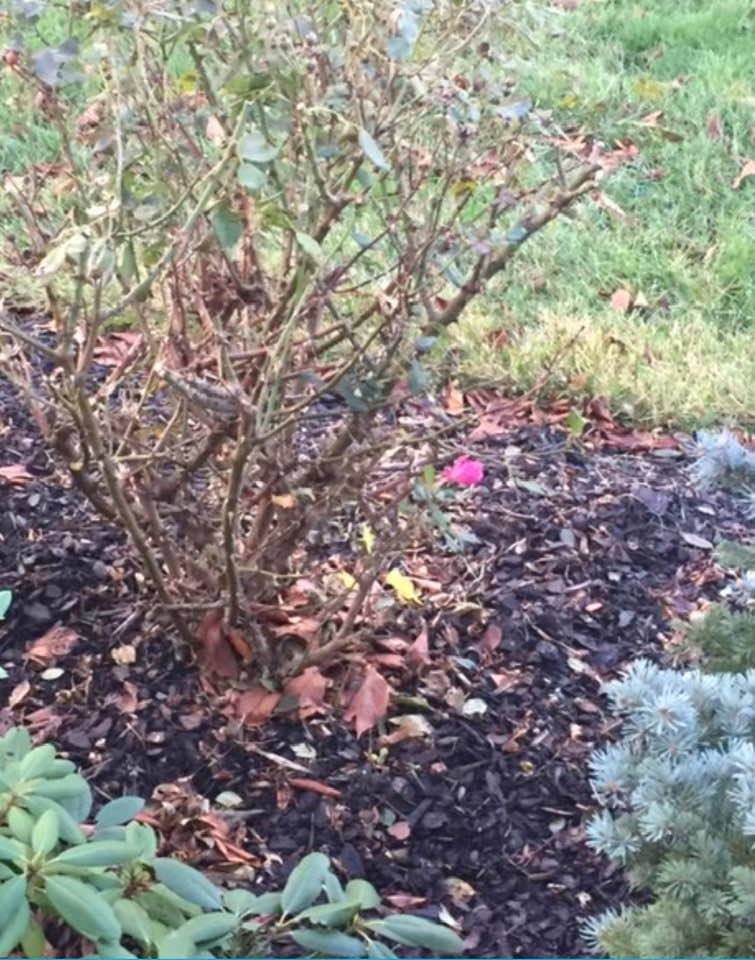 I was standing out in the yard talking to the florist delivery woman for the second time that day. As I turned to go back inside, something drew my attention to the far side of the yard. I walked over to get a closer look. At first it looked like scrap of pink tissue stuck on a low thorn on our Knock Out rose bushes. A closer look revealed that it was a pink rose. It wasn’t a perfect rose. It looked as if it had quickly bloomed a few days earlier, with only a few malformed petals. I cut it and put it in a bud vase on the table where all the other florist flowers were displayed. The next day, I noticed two more pink buds. Throughout the week they kept budding. In December. In Maryland.