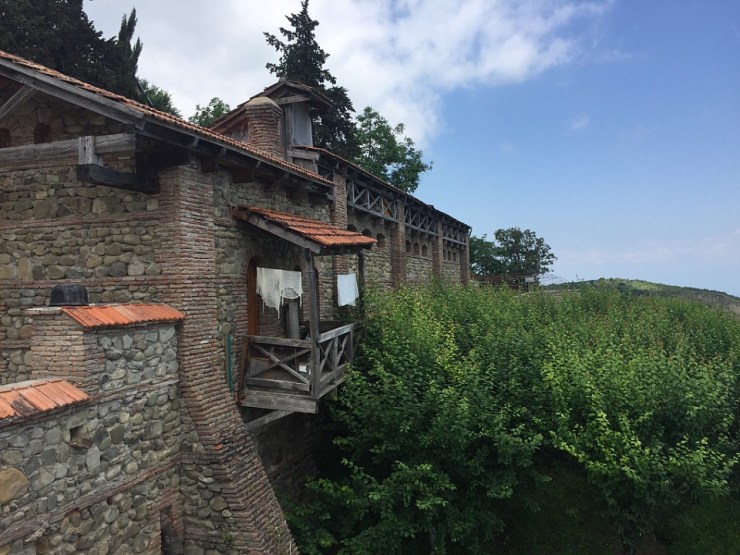 We drove about an hour and a half to the region of Kakheti. Misha explained that this was the burial place of St. Nino, and a destination of pilgrims over the centuries. Nino, the fourth century female evangelist credited for converting the ancient Kingdom of Iberia to Orthodox Christianity was new to me. but her story fascinated me. In her later life, she withdrew to the area of the Bodbe Gorge, in Kakheti, our morning destination, where she died between 338 – 340 AD. To memorialize her, King Mirian III had a small monastery built where she was buried.