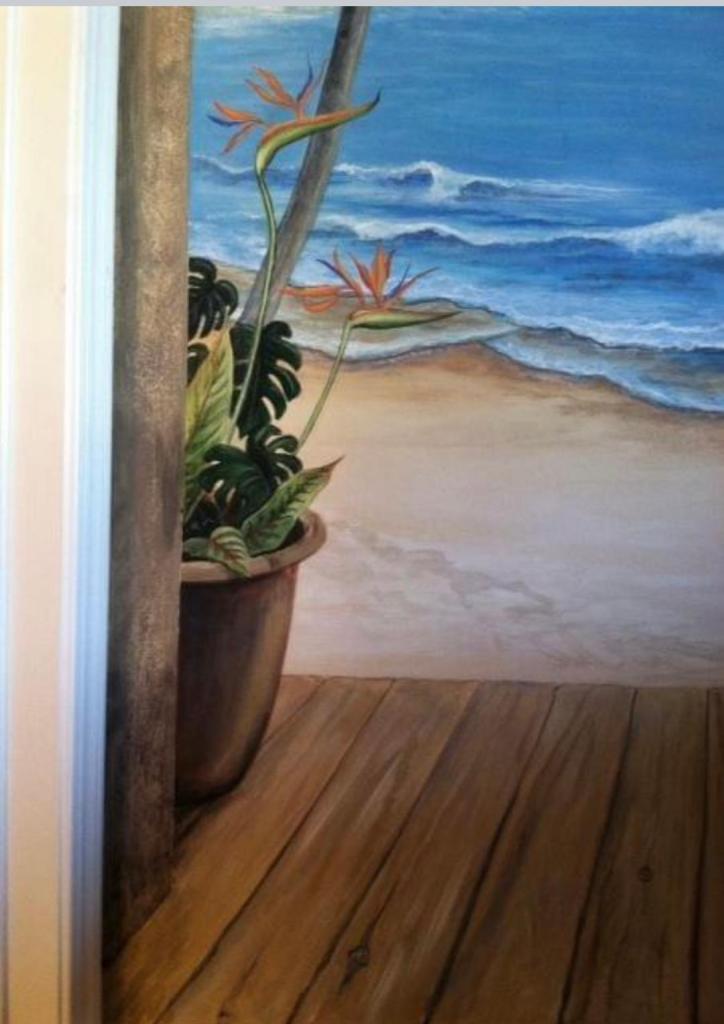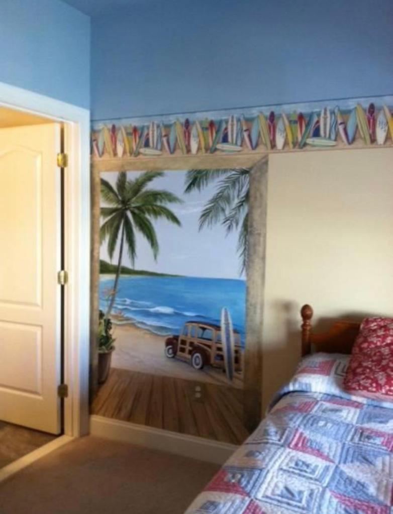 When my Facebook memories come up from years ago about my completion of murals on my (now his) walls, I’ve often wondered if they were under a fresh coat of paint. It’s his family’s home now, so they can decorate as they wish. I certainly changed a LOT about the house in which we now live. But he eased my mind when he said that when company comes, he gives them a tour of the house, and everyone loves the murals. He said that his two teenage nieces who live with them have traded back and forth in Roma’s old room with the beach mural, but they usually save it as the guest room.