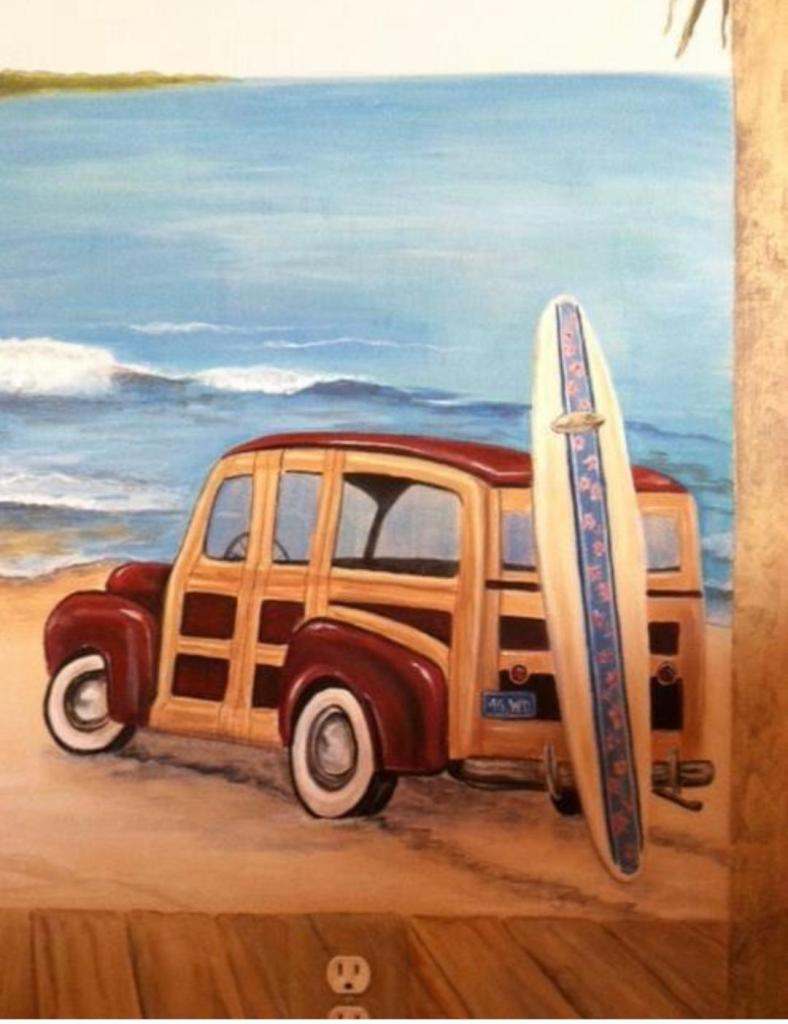 Here are some of the murals that are on Tony’s wall. Roma’s former room I painted one year when we weren’t going to the beach. I brought the beach to him. The woody station wagon was parked in front of the Laguna Beach Marriott in California where we stayed for our niece’s wedding. I added it as a reminder of what Roma called the best weekend ever.